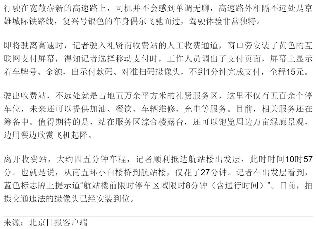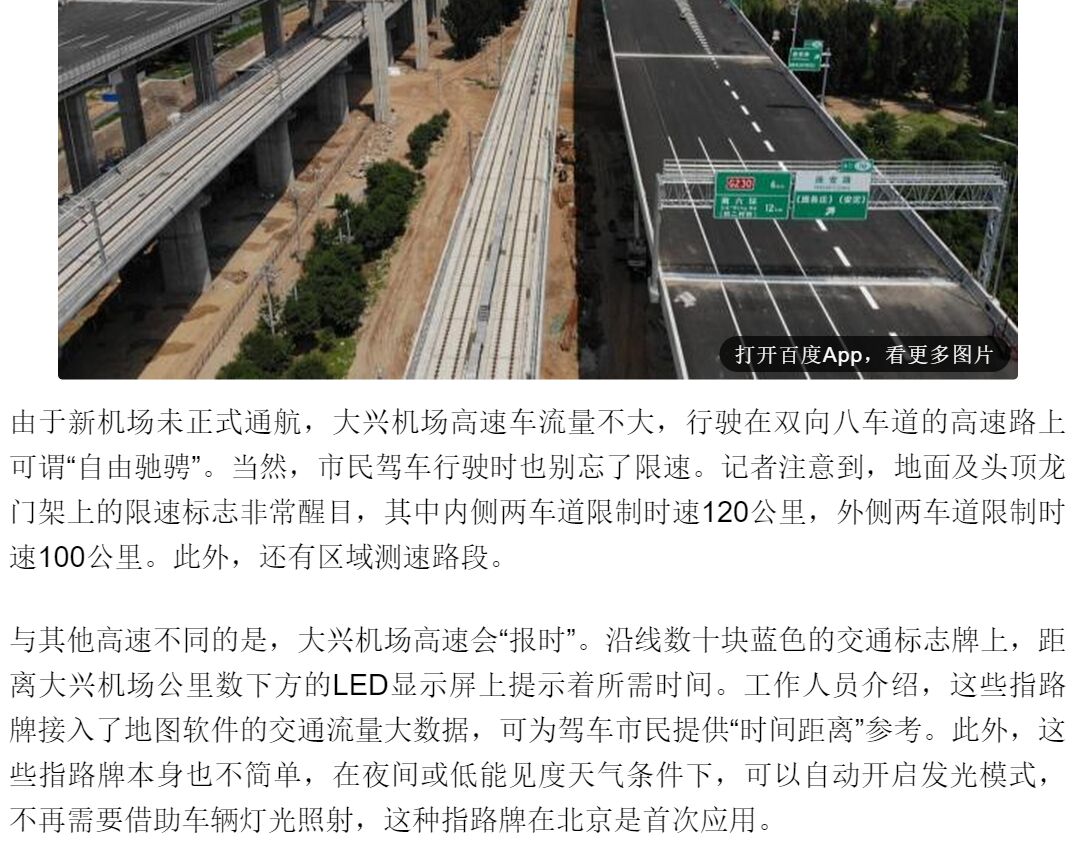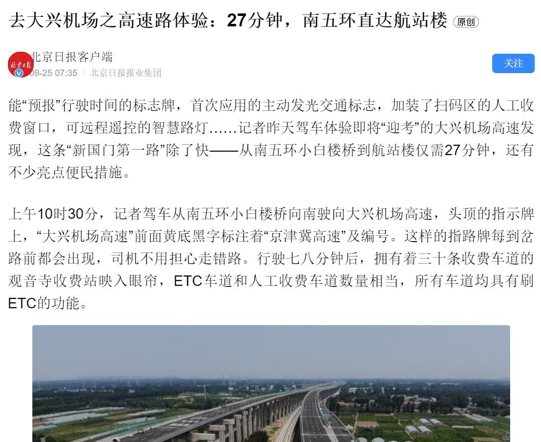9月25日,《北京日報(bào)客戶端》在“去大興機(jī)場之高速路體驗(yàn):27分鐘,南五環(huán)直達(dá)航站樓”新聞報(bào)道中提到:“能“預(yù)報(bào)”行駛時(shí)間的標(biāo)志牌,首次應(yīng)用的主動(dòng)發(fā)光交通標(biāo)志,加裝了掃碼區(qū)的人工收費(fèi)窗口,可遠(yuǎn)程遙控的智慧路燈.......”,"與其它高速不同的是,大興機(jī)場高速會(huì)“報(bào)時(shí)”。沿線數(shù)十塊藍(lán)色的交通標(biāo)志牌上,距離大興機(jī)場公里數(shù)下方的LED顯示屏上提示著所需時(shí)間。工作人員介紹,這些指路標(biāo)志牌接入了地圖軟件的交通流量大數(shù)據(jù),可為駕車市民提供“時(shí)間距離”參考。此外,這些指路牌本身也不簡單,在夜間或低能見度天氣條件下,可以自動(dòng)開啟發(fā)光模式,不再需要借助車輛燈光照射,這種指路牌在北京是首次應(yīng)用"。