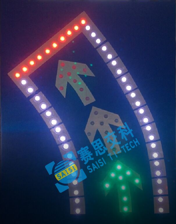 2、工藝說明:標(biāo)志版面由LED發(fā)光管組成停車線、邊緣線、箭頭圖形,通過控制模塊調(diào)取信號(hào)燈燈色狀態(tài),在標(biāo)志版面形成動(dòng)態(tài)三種狀態(tài),動(dòng)態(tài)引導(dǎo)待轉(zhuǎn)車流通行權(quán)限。