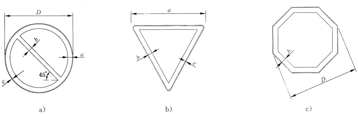 依據國標《道路交通標志和標線》(GB5768.2)中所列圖案,除部分特殊標志,常見的禁令標志為圓型,紅色邊框、黑色斜杠。警告類標志,具體尺寸大小根據道路設計時速而定,通常有直徑60cm、80cm、100cm、120cm等四種。參考依據如下圖所示。