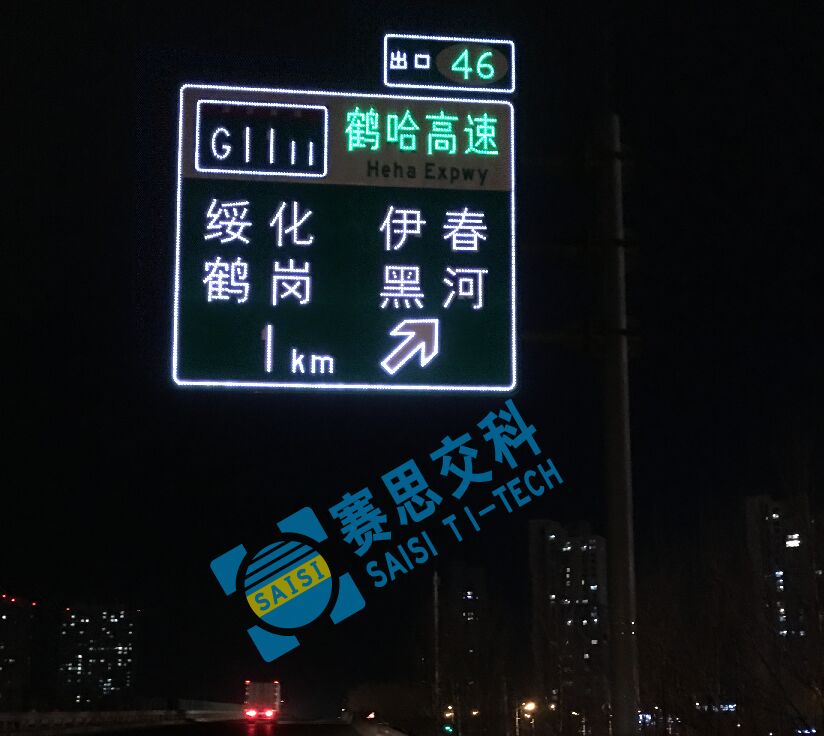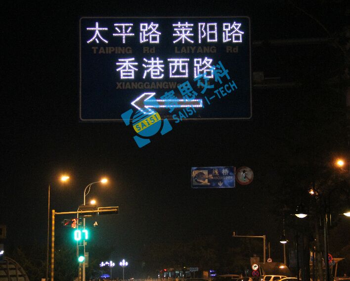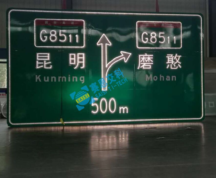 “大型指路類點陣型主動發光標志”,其標志版面中圖案、文字、數字、字母、邊線等外嵌高亮LED發光管,并通過調光測試軟件,將LED發光管合理布點,并設置合理的發光強度,形成由點光源組成的面光源視認效果,實現標志牌能主動發光的功能特性,滿足人眼正常、和諧的視覺捕捉及視認效果。