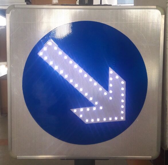 指示類道路交通發光標志牌,其主要功能為對特定通行行為、通行屬性的指示與限定。如“機動車與非機動車分道標志”、“右下行通行標志”、“向右轉彎標志”、“線性誘導標志”、“單行線指示標志”、“環島指示標志”、“人行橫道指示標志”等。其形狀主要為長方形或方形;其顏色:城市道路主要為藍底白色圖案;快速路、高速路為綠底白色圖案。該類標志,通常選用“全透面板型主動發光標志”、“外置點陣型主動發光標志等類型。