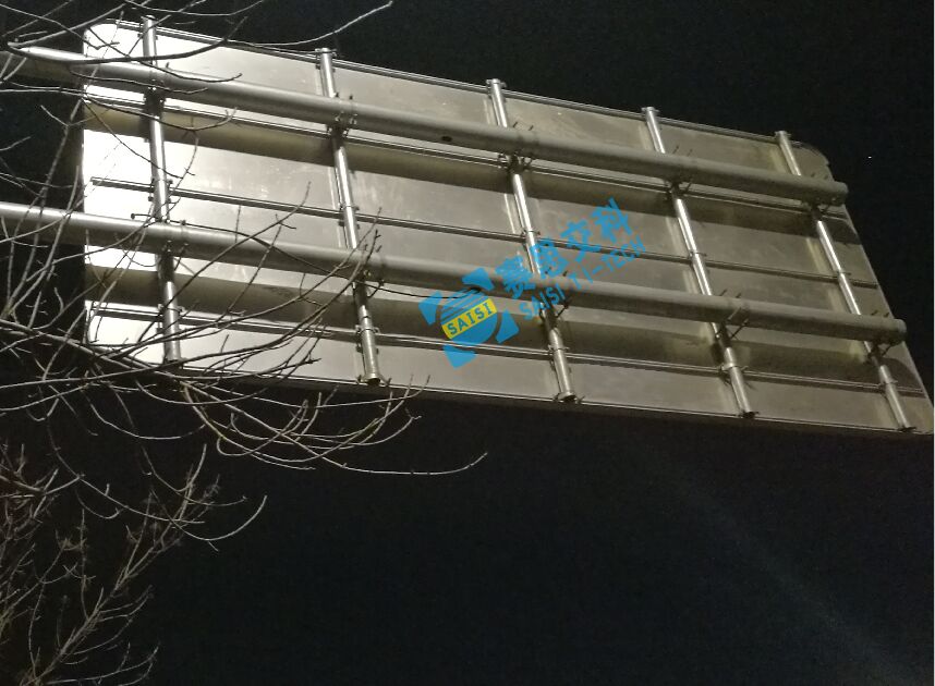 半透發(fā)光標(biāo)志整體重量,較普通標(biāo)志重,通常約25KG/平米,如果僅采用傳統(tǒng)標(biāo)志的滑槽固定結(jié)構(gòu),標(biāo)志的整體重量僅靠背板與抱邊連接處承擔(dān)重力,會導(dǎo)致標(biāo)志后背板出現(xiàn)凸型拉伸面,長久下去,若遇上大風(fēng)的橫向風(fēng)壓,極易發(fā)送結(jié)構(gòu)脫落的危險隱患。我們通常采用外接鍍鋅管轉(zhuǎn)移受力結(jié)構(gòu),將鍍鋅管的一段連接在標(biāo)志的整體承重框架中,一段安裝抱箍、卡箍連接懸臂桿,保證的安裝結(jié)構(gòu)的整體受力穩(wěn)固,能抵御較大的自身重力和橫向風(fēng)壓。