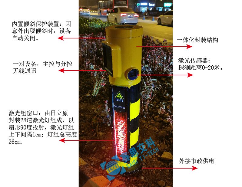 當行人即將進入斑馬線將要過街的瞬間,本裝置快速、準確檢測到有行人過街,立刻投射28條紅色激光線到過街行人小腿處,形成明顯的紅色區域投影警示,機動車駕駛員可以在照明不足、注意力不集中或視線受影響情況下(對面車輛遠光、雨霧天氣等),遠距離得到紅色警示和發現行人動態,并及時做出反應,從而減少交通意外的發生。
