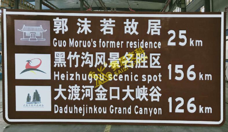 采用主動發光工藝的旅游標志牌,其版面通常由:風景點名稱文字、預告距離、引導方向箭頭、風景區圖片LOGO等組成,標志底板采用棕色反光膜(旅游標志專用膜)。標志主動發光工藝,采用內置光源定向投射標志面板,形成自主發光的效果。其優點主要有: