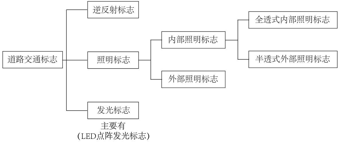 要了解主動發光標志,首先須了解它的大致分類和名稱。依據國標《道路交通標志和標線 之 第2部分 道路交通標志》(GB 5768.2~2022版)之4.2.4條分類定義,“道路交通標志按光學特性分類,分為逆反射標志、照明標志和發光標志,其中照明標志按光源安裝位置又分為內部照明標志和外部照明標志”。其中“逆反射標志”,就是常說的“非光源類”反光膜標志牌,僅依賴于反光膜的逆反射功能來實現標志牌受光后的反光效果;如果把“內部照明標志”按照發光面積與整版面積的占比度,再繼續拆分出子概念,就目前市場可見,內部照明標志又分為“全透式內部照明標志”和“半透式內部照明標志”。其中“發光標志”,國標沒有明確給出定義和概念的內涵,但從其分類上來思考,大致可以知道其劃分的依據:逆反射標志——自身沒有發光光源;照明標志——標志面板外,或標志內部有光源;剩下的“發光標志”該如何定義?從概念的外延上,采用逐一排除法,剩下的就是“標志面板上有光源”這一類,其產品主要有、但不僅限于“LED點陣發光標志”,其分類層次圖大致如下。