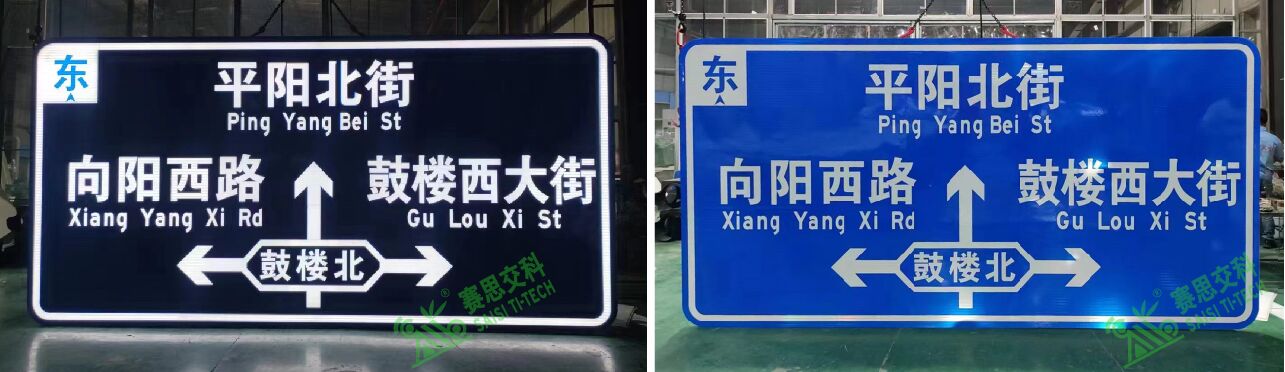 背透式主動發光標志,在選用反光膜時有一定要求,除了要具備反光膜的各項技術要求外,還需要其透光性能、均光性能指標滿足要求,而國標《道路交通反光膜》(GB/T18833)的14項檢測要求中,并沒有就透光性、均光性給出明確的標志,這就要求各廠家在生產中,通過不斷測驗、驗證,來找到合適反光膜選材,通常IV類以下級別的反光膜,在制作背透式主動發光標志時,其面層的韌性,和背膠層與導光板的黏合性,不宜制作;而采用V類反光膜,標志在夜間點亮時,會出現幾種反光:(1)機動車的照射光;(2)照射后的反光膜;(3)標志自身的主動發光;(4)標志發光后在反光膜面層上的漫反射反光。由于其大廣角的高逆反射功能,上述幾種光都很強,互相融和在一起,就產生了炫光、光團,反而影響了標志版面內容的視認。故,我們經過大量測試,并與反光膜廠合作定制,專門用于生產背透式主動發光標志的專用國標IV類反光膜,其透光率應≥20%,均光率應為1.2:1~1.3:1區間值。