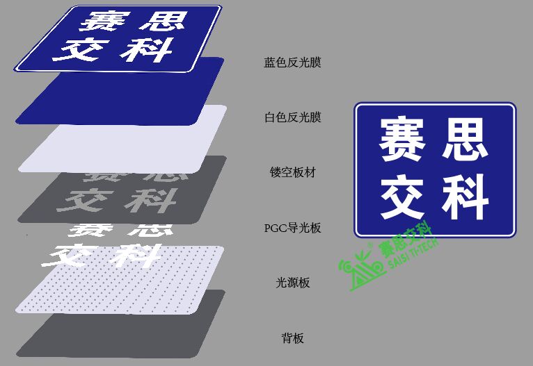 背透式主動發光標志,以藍白配色的指路標志為例,如果從正面一刀切開,我們會依次看到:藍色反光膜、白色反光膜、鏤空雕刻的鋁板(鏤空位置填充的PGC透光板)、高亮混光型光源板(含內部支撐結果)、電路元器件、標志背板、滑槽。而所有的這些,都要集中布設在厚度僅為4cm左右的框體結構內,所以,對整體結構的穩定性、布設的合理化、用材搭配的精細化,都要求非常高。