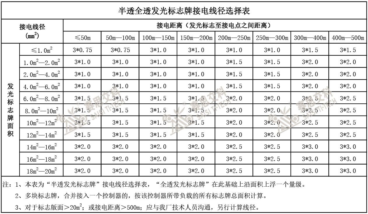 半透全透式內置照明發光標志,其接電線材的線徑選擇,主要受著幾方面因素影響:(1)控制器負載發光標志牌的整體功耗。發光標志牌采用內置LED光源板,標志版面越大,其所用的光源板面積就越大,整體功耗也就越大,所以,發光標志牌的功耗,通常與其版面面積大小成正比關系,業內也常根據版面面積來測算標志的大概功耗情況,標志的功耗越大,其接電所需的線徑也就越大。(2)接電距離的遠近。發光標志牌的取電距離,是指標志牌安裝地點到接電處的距離,根據電學常識,我們知道,同等線徑的線材,其取電距離越長,電阻越大,其電壓衰減就越明顯,所以,對于接電距離長的,要保證具備穩定的電壓承載負載電壓,就需要提高足夠的線徑給予保障。(3)發光標志類型。半透式發光標志牌,是僅僅標志版面中的內容、圖案、線條部分發光,而非像全透發光標志那樣整體版面都發光,所以,前者的單位面積的功耗,較后者略低點。現將內置照明發光標志的接電線徑參考表,整理如下: