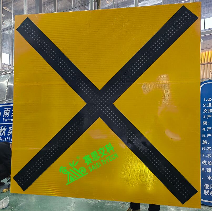 發光禁航標志的整體形狀為方型,版面為黃色底膜,黑色叉形圖案,通常采用2000mm*2000mm,或2400mm*2400mm尺寸;主要設置于橋孔上方,表示該橋孔僅為對向航道通航方向,本方向為禁航方向,不得通行。根據國標《中國海區可航行水域橋梁助航標志》(GB 24418)的技術要求,版面圖標如下: