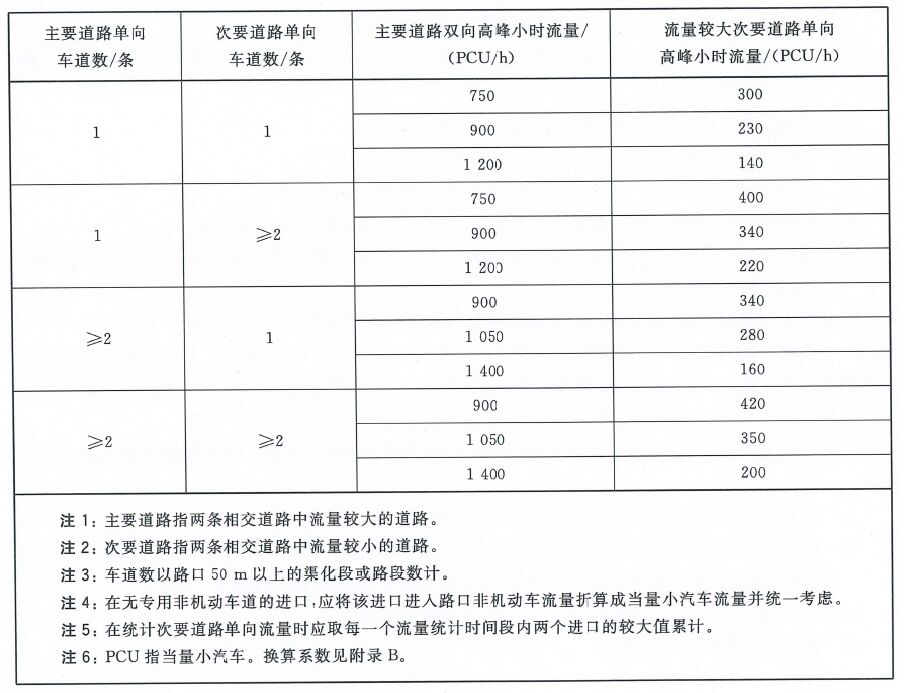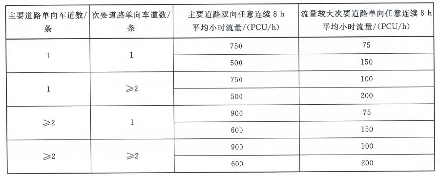 I、條件一:路口機動車高峰小時流量超過下表所列數值時;