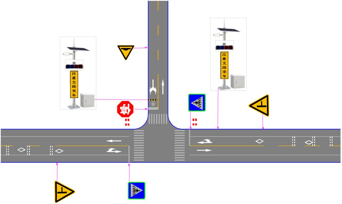 A)支線上設置減速讓行、或停車讓行標志,有條件可采用太陽能主動發光標志,或于標志上方配置太陽能爆閃警示燈。