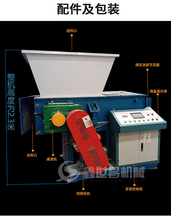 膠頭料撕碎機單軸撕碎機主要由刀片主軸、定刀、承載箱體、箱體支架、進料系統、液壓推料系統、動力系統、電器控制系統組成的機器,膠頭料撕碎機型號從600,800,1000,1200均有現貨。
